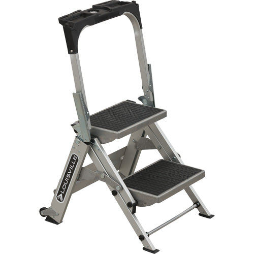 Escabeau léger avec un dessus moulé ProTop™ avec emplacements pour outils et accessoires. Pieds en aluminium antidérapants. Barres d'écart...