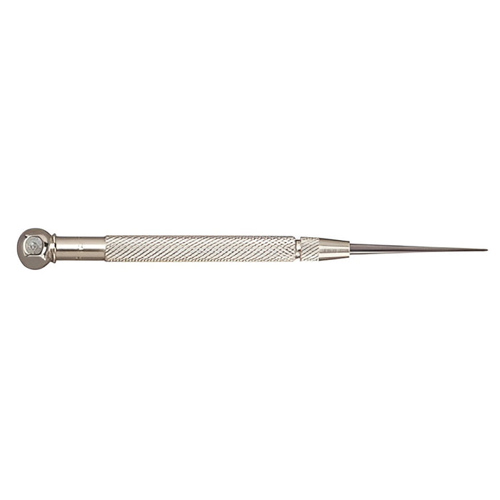 Ce traceur est composé d’un manche en acier, recouvert de nickel et moleté, ainsi que d’une pointe en acier trempé de 60mm. Celle-ci est maintenue solidement dans le manche grâce à un mandrin moleté, lui donnant aussi la capacité d’être rangée dans le manche et bloquée par ce dernier. Sa tête de forme hexagonale lui permet une prise ferme, permettant d’éviter le roulement durant l’utilisation.