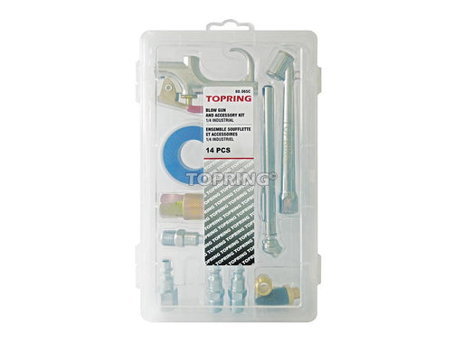 Assortiment d'accessoires pour l'air comprimé contenant 14 accessoires dans un boîtier de rangement en plastique avec un crochet intégré. Idéal pou...